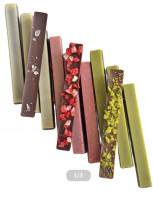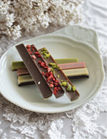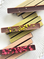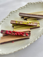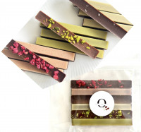 カカオ含有量68%のミルクローチョコレートに白味噌を練り込み、有機抹茶でコーティング。ピスタチオをあしらい、後味はほんのり塩味。